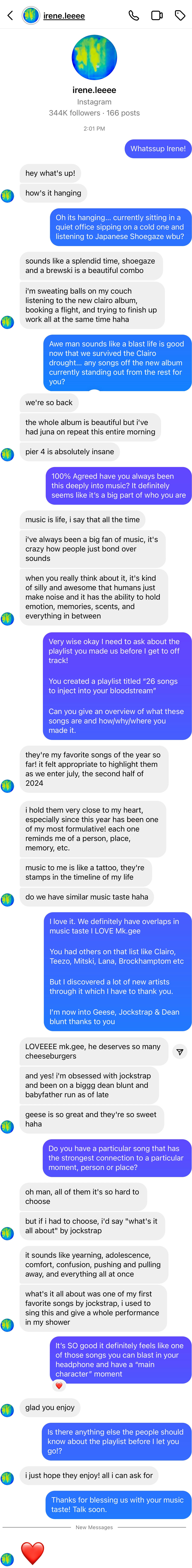 This month's issue features the internet’s favorite philosopher... Irene Lee. Irene is a long-time music curator with taste beyond her years. Today, she takes us on a JOURNEY. We jump genres, discover underground heavy hitters, and hear from a few familiar names. Give it a listen and discover your next favorite band. We know we did (it’s a band named “Geese” babby).