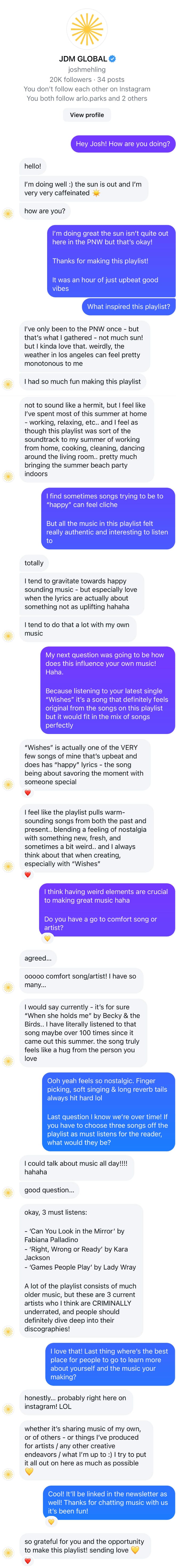JDM Global (Josh Mehling) is an indie artist out of southern california. If you like the vibes of this playlist you’ll love his music. Embodying a modern pop sound with hints of nostalgic inspiration. Check out his latest single, "Bronco," here.
