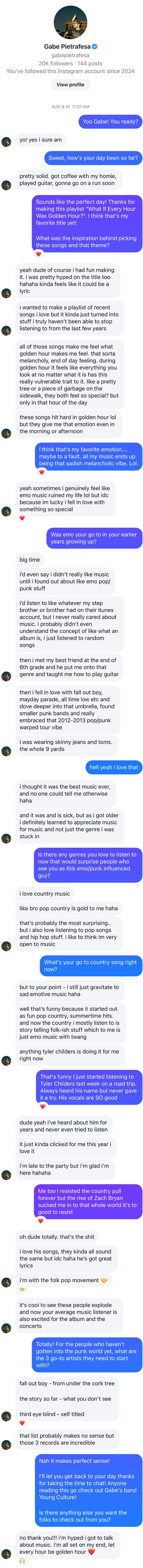 This week's playlist is curated by Gabe Pietrafesa! (You may know him as 06 Nissan). It consists of a quick hit of songs spanning genres from pop-punk to alternative/indie to folk that all have one common denominator... They all give you that "melancholy, end-of-day feeling," as Gabe put it.